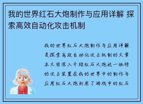我的世界红石大炮制作与应用详解 探索高效自动化攻击机制