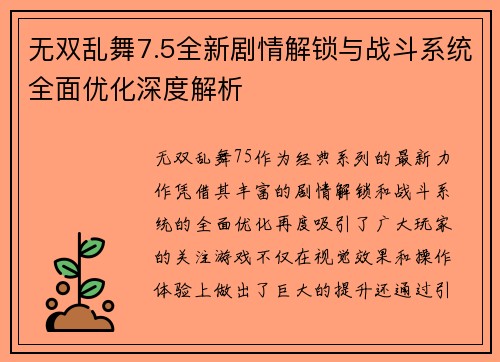 无双乱舞7.5全新剧情解锁与战斗系统全面优化深度解析
